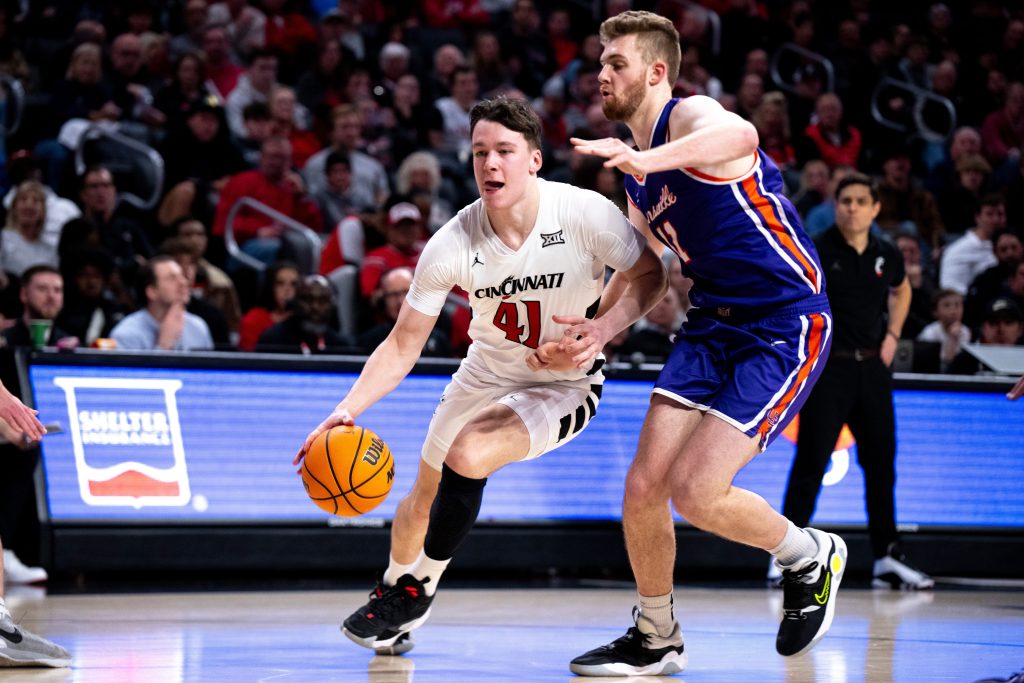 Cincinnati Bearcats guard-forward Simas Lukošius (41) drives on Evansville Purple Aces forward Joshua Hughes (11) in the second half of the NCAA basketball game between Cincinnati Bearcats and Evansville Purple Aces at Fifth Third Arena in Cincinnati on Friday, Dec. 29, 2023.