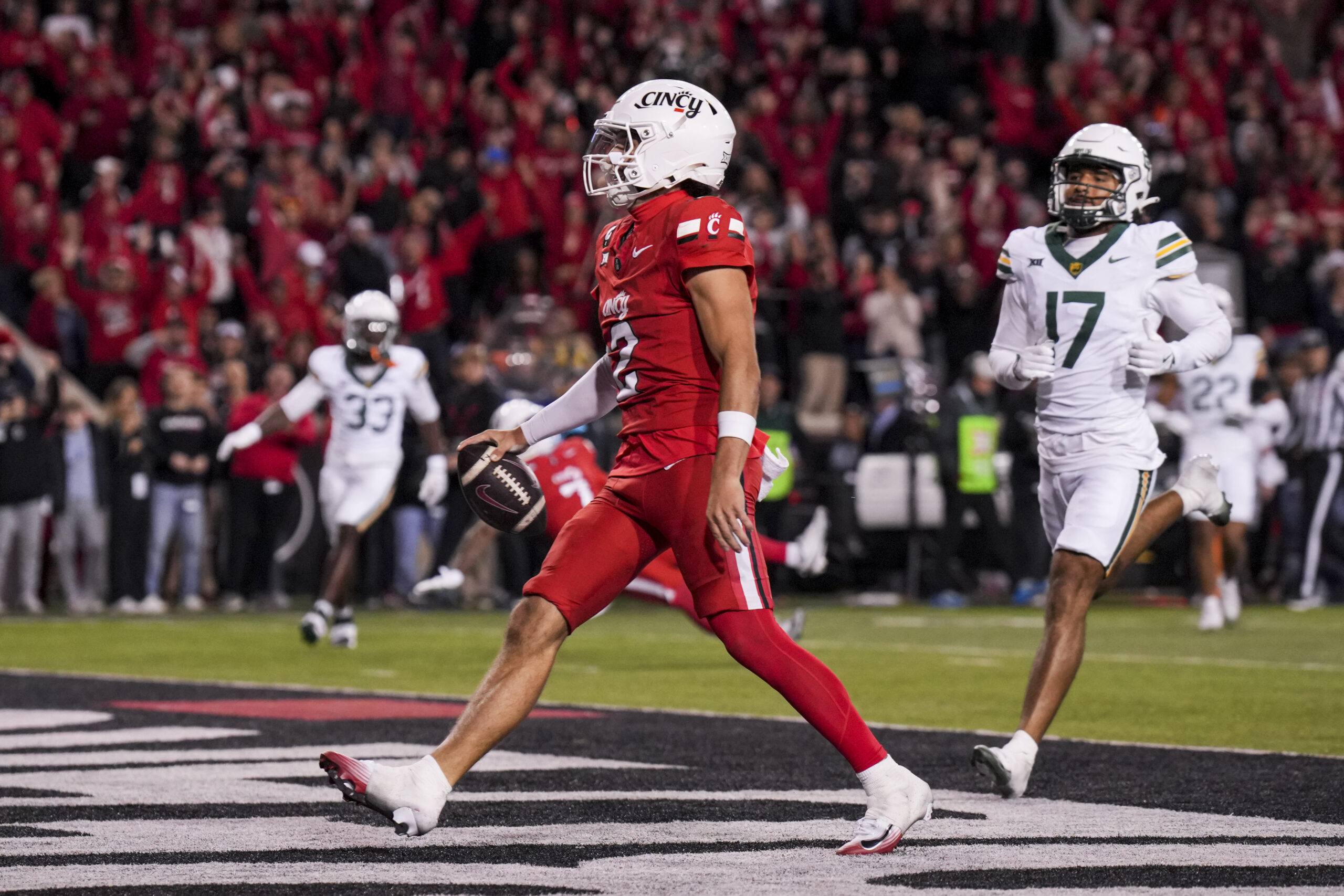 Oct 25, 2025; Cincinnati, Ohio, USA; Cincinnati Bearcats quarterback Brendan Sorsby (2) runs with the ball for a touchdown against the Baylor Bears in the second half at Nippert Stadium. | Aaron Doster-Imagn Images