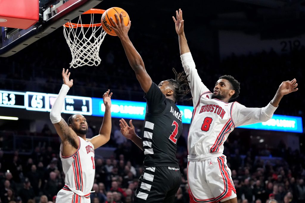 Two free throws from Jamille Reynolds with 1:41 left made it a two-point game, 61-59. LJ Cryer hit a runner with 1:13 left and Ja’Vier Francis slammed home a miss with 40 seconds left for a 65-59 Houston lead.