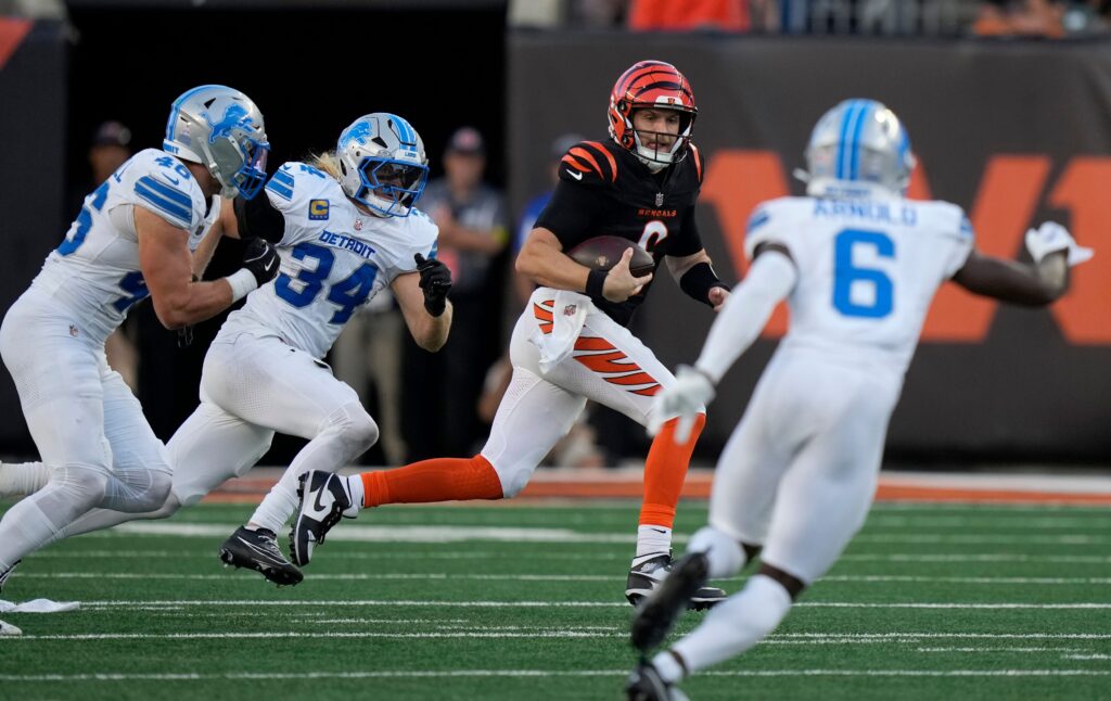 Cincinnati Bengals quarterback Jake Browning (6) runs the ball agains the Detroit Lions at Paycor Stadium on October 5, 2025. The Bengals lost 24-37.