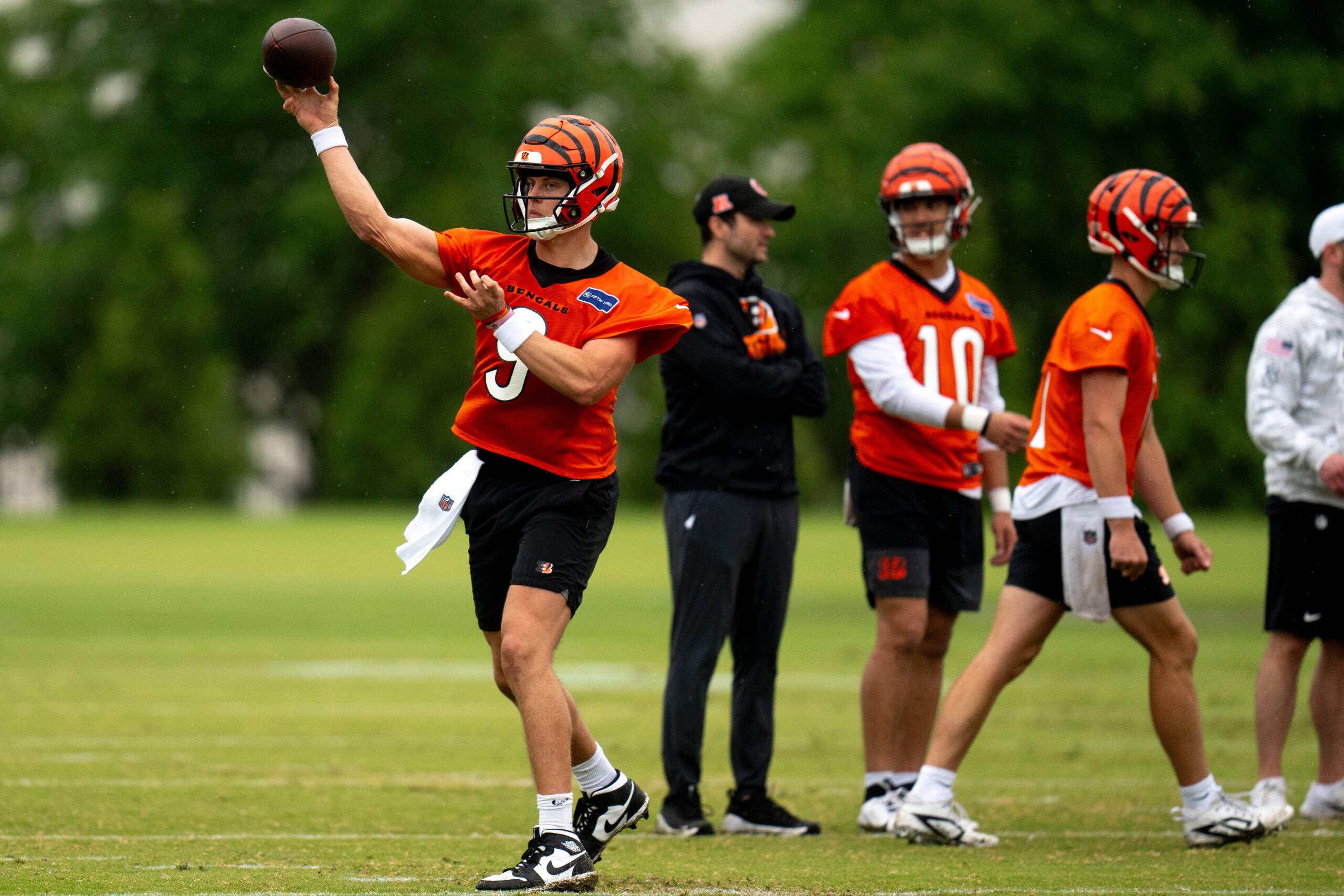Bengals quarterback Joe Burrow (9) throws a pass during the Cincinnati Bengals practice in Cincinnati on Tuesday, (Imagn Images)