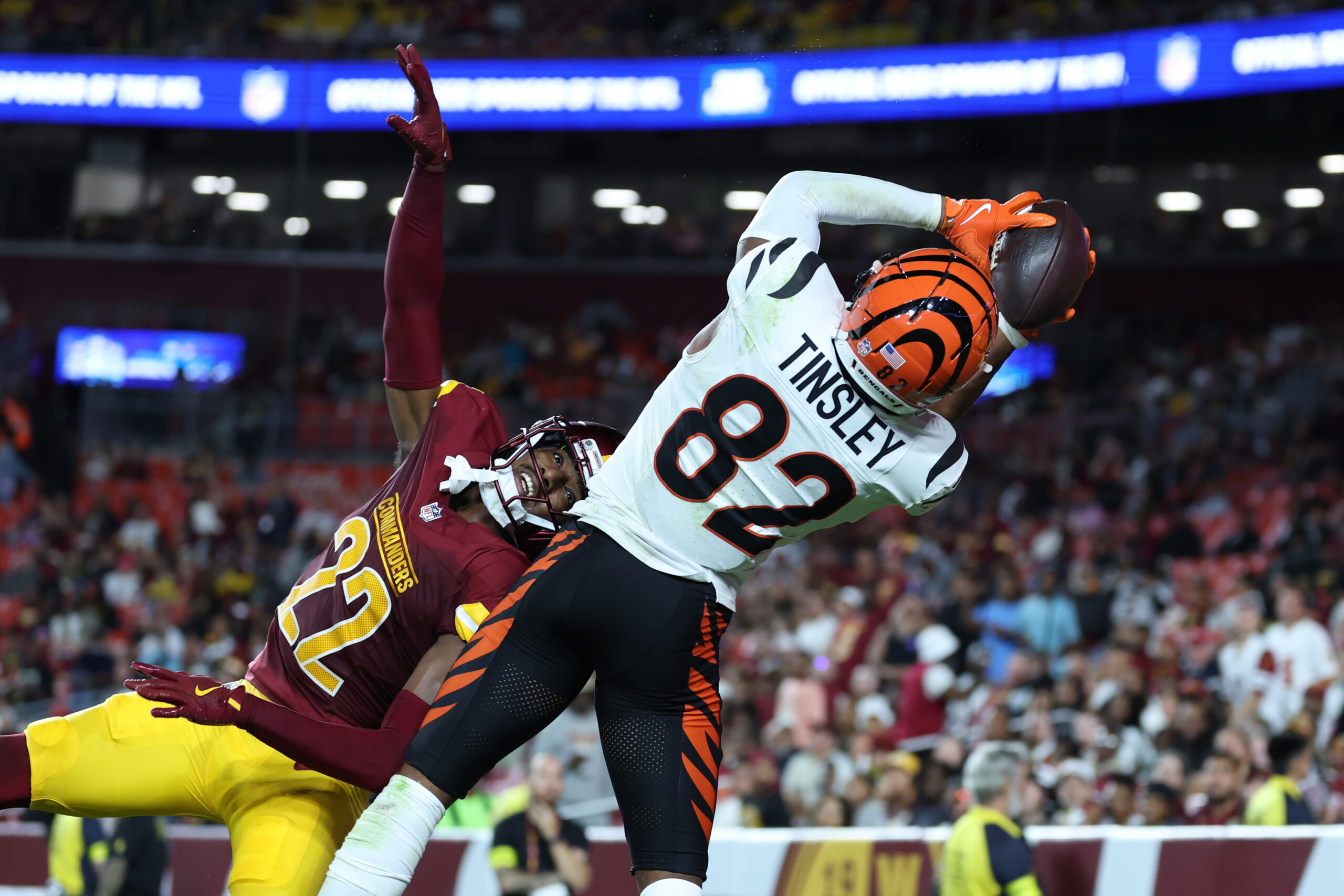 Bengals wide receiver Mitchell Tinsley (82) catches a touchdown pass over Washington Commanders cornerback Car'lin Vigers (22) during the first half at Northwest Stadium. (Amber Searls-Imagn Images)