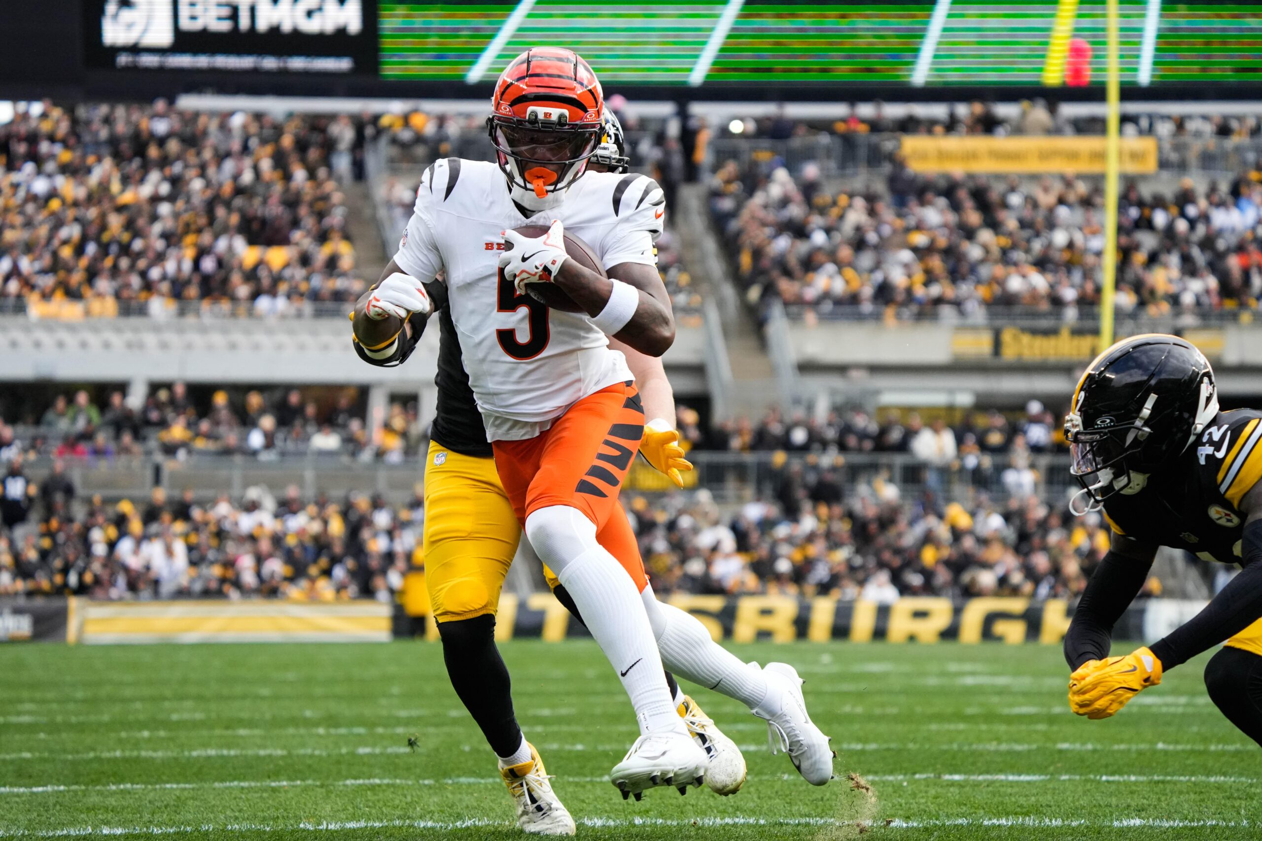 The focus shifts to Tee Higgins if Ja'Marr Chase is out Sunday. Here Higgins catches the only touchdown for the Bengals Sunday in Pittsburgh. (Imagn Images)
