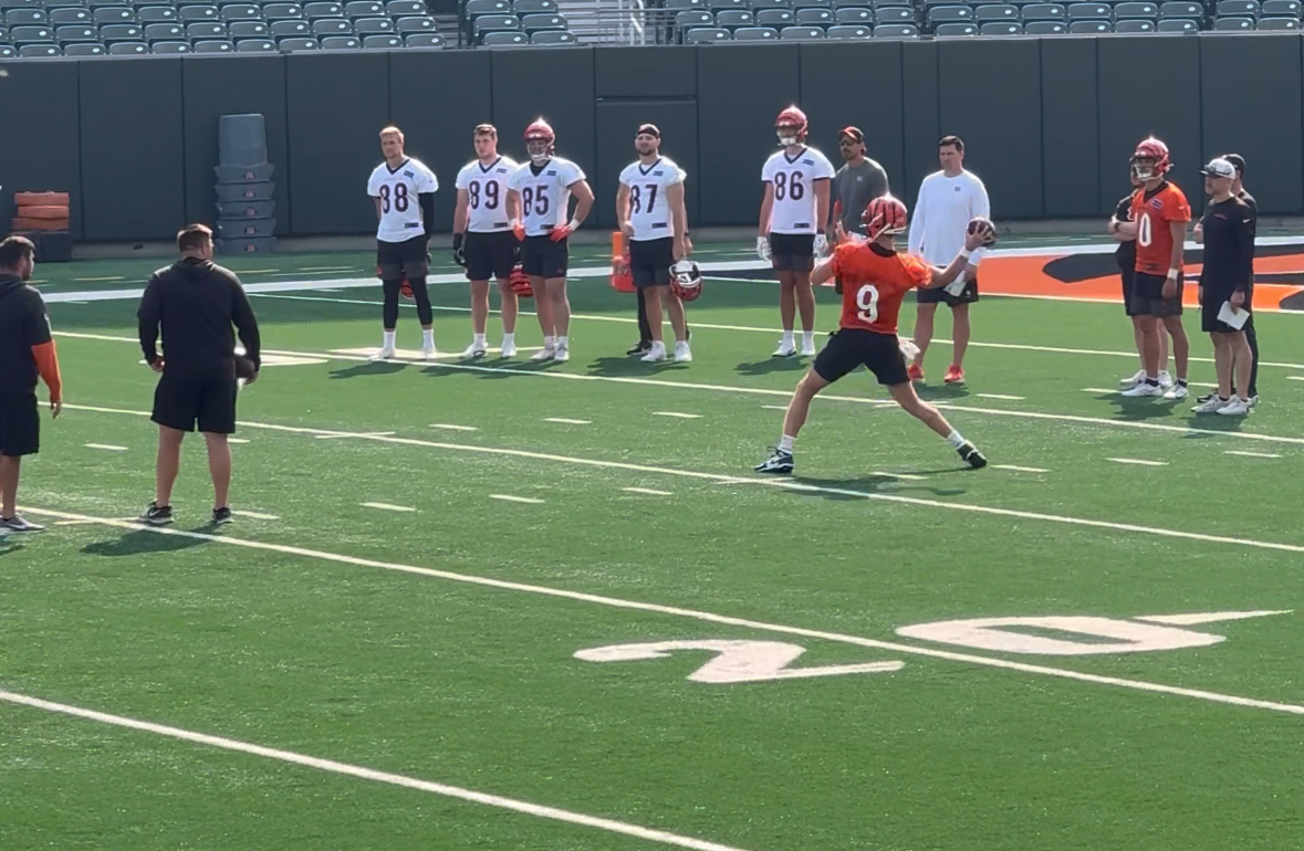 Joe Burrow fires a pass downfield on the final day of mandatory minicamp inside Paycor Stadium Thursday. (Mike Petraglia/CLNS Media)