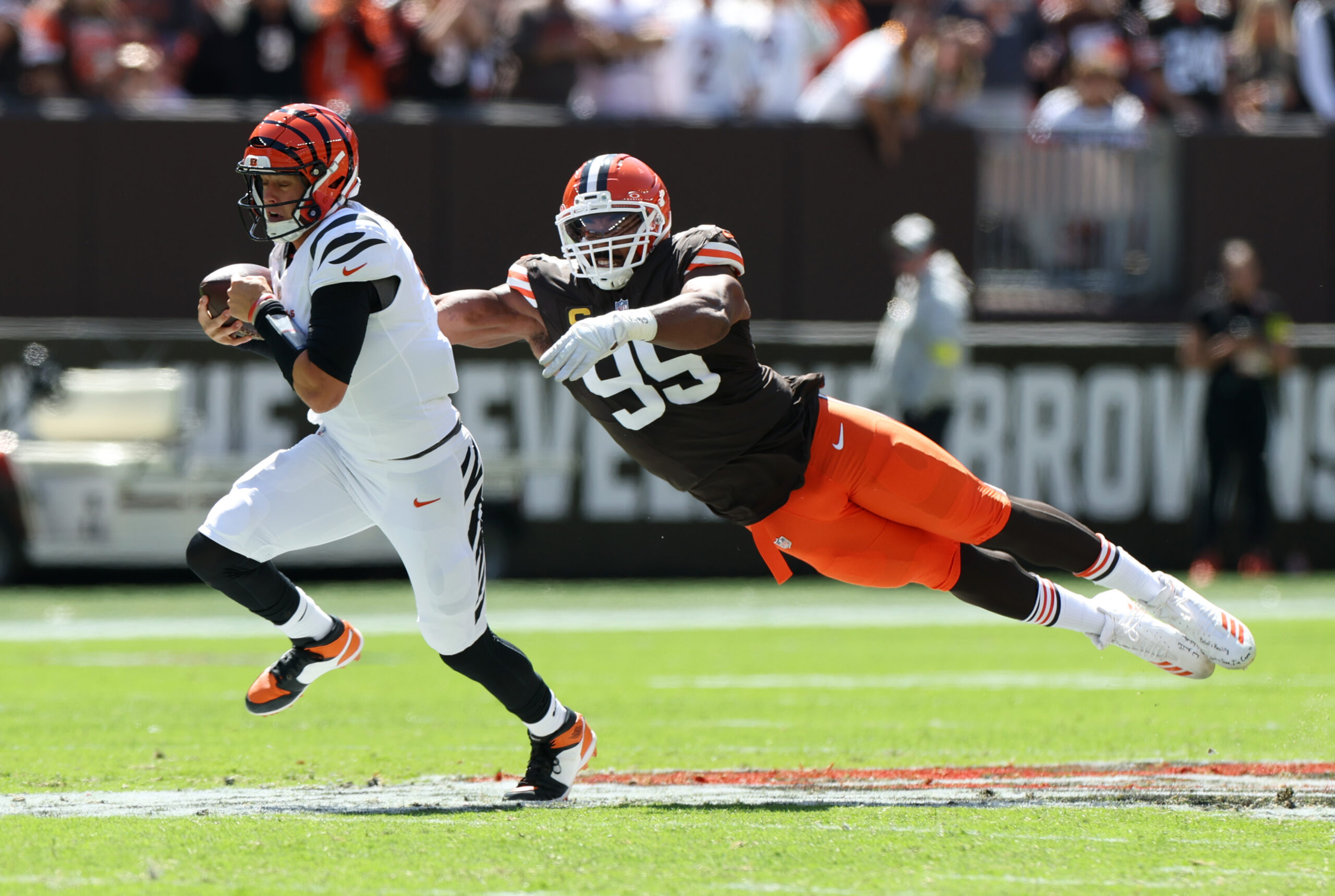 Browns defensive end Myles Garrett (95) tackles Cincinnati Bengals quarterback Joe Burrow (9) during the second quarter at Huntington Bank Field. (Scott Galvin-Imagn Images)
