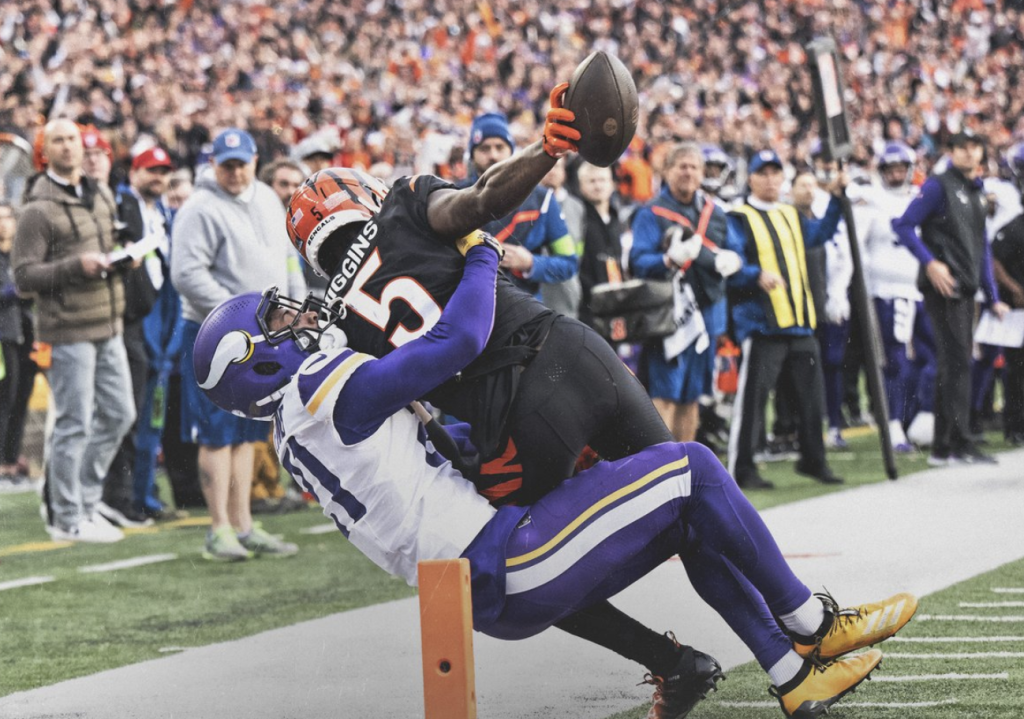 The Bengals had their best rhythm of the first half on their game-opening drive, marching down to the Minnesota 12. But on third down, the Bengals tried a trick play, a reverse to tight end Tanner Hudson, who had the option to throw a pass to either Tee Higgins or Ja’Marr Chase.