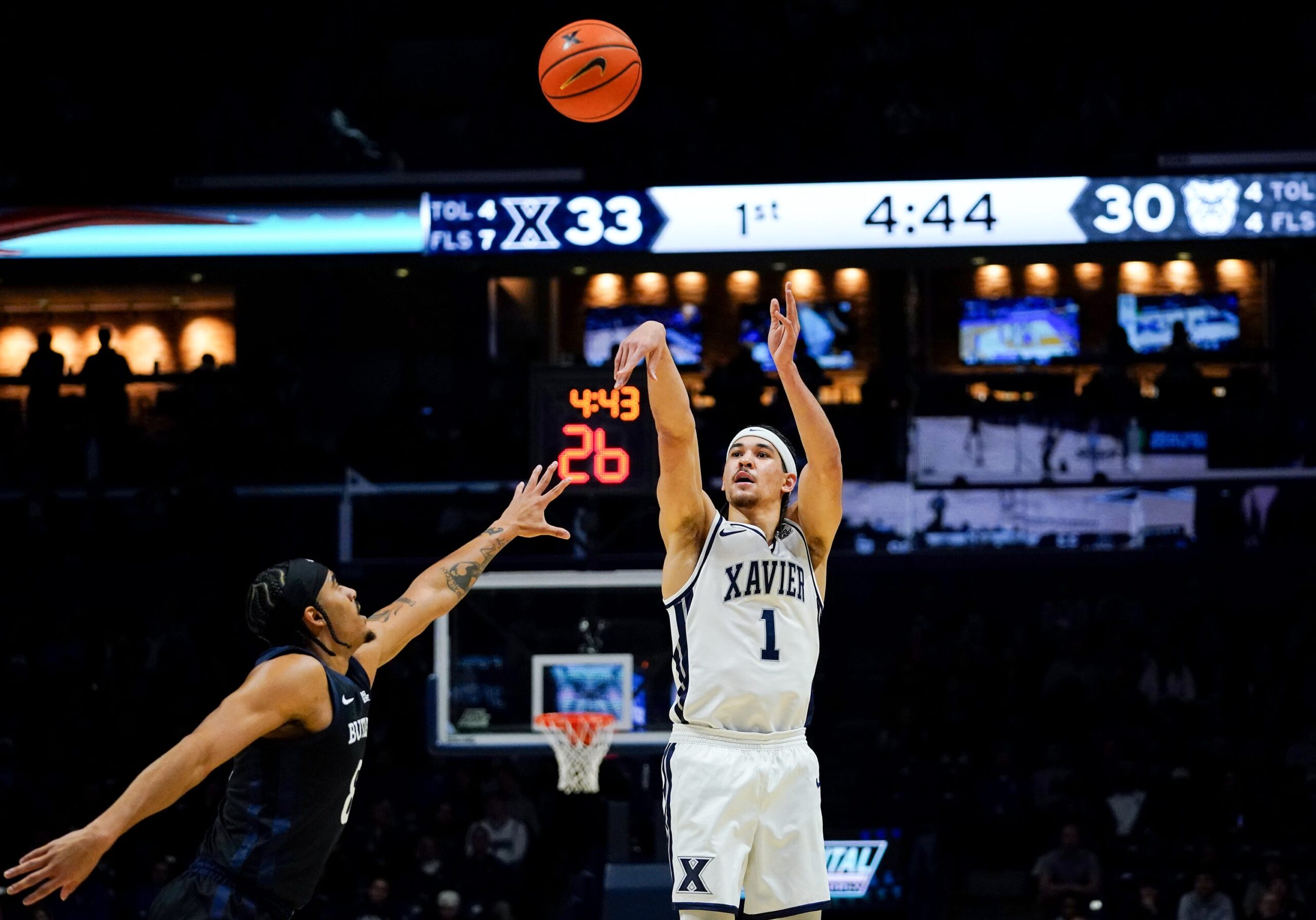 Xavier Musketeers guard Malik Messina-Moore (1) hits a shot from three point range in the first half Wednesday at Cintas Center (Frank Bowen IV/Cincinnati Enquirer)