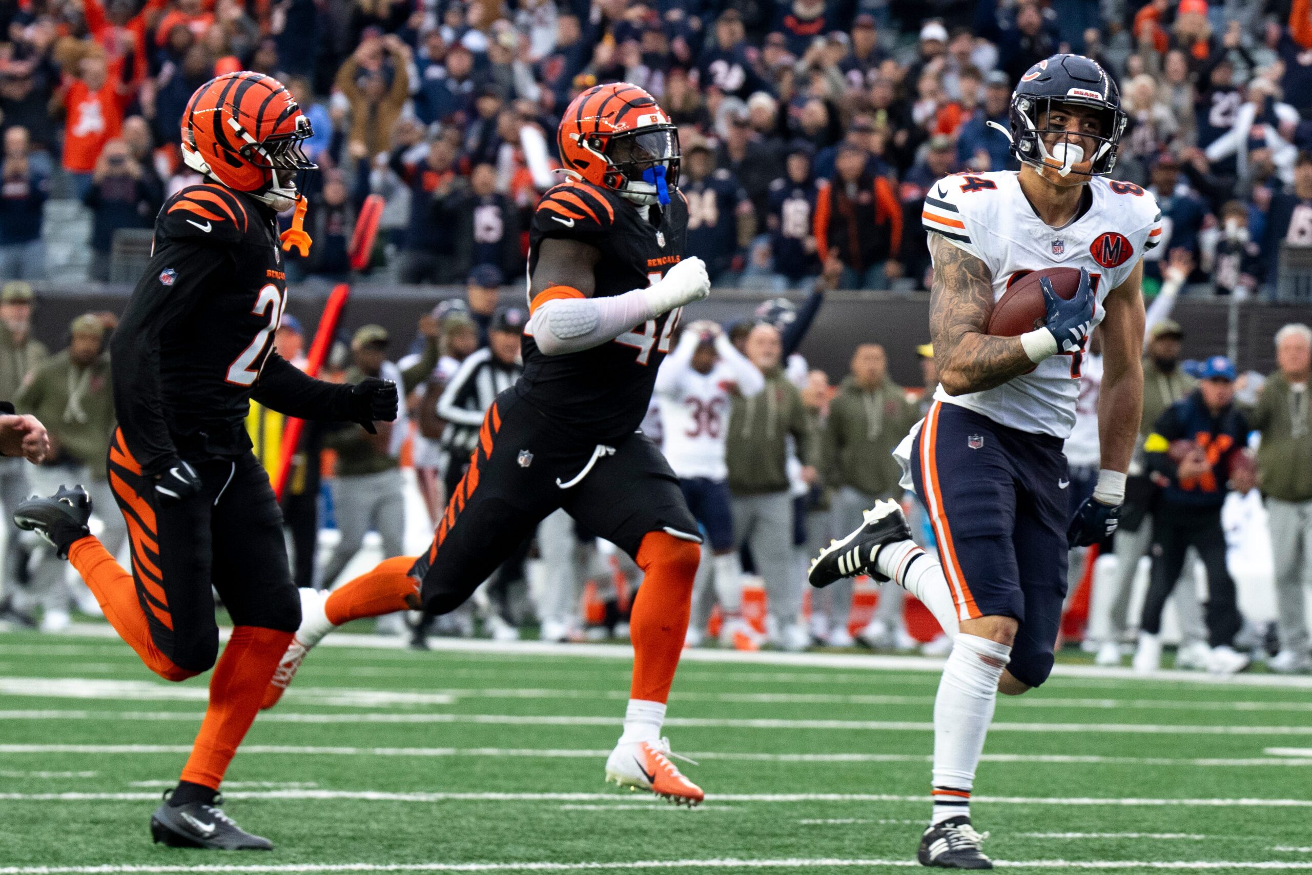 Backup running back Kyle Monangai ran for 176 yards on 26 carries for the injured D’Andre Swift. The Bears ran up 576 yards of total offense against a porous Cincinnati defense, the second-straight week the Bengals have allowed at least 500 yards.