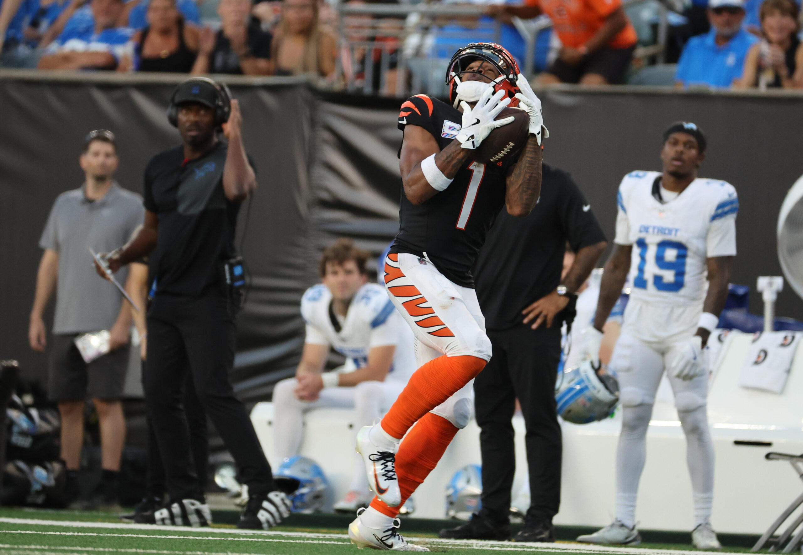 Bengals wide receiver Ja'Marr Chase (1) catches a pass for a touchdown during the fourth quarter against the Detroit Lions at Paycor Stadium. Mandatory Credit: Joseph Maiorana-Imagn Images
