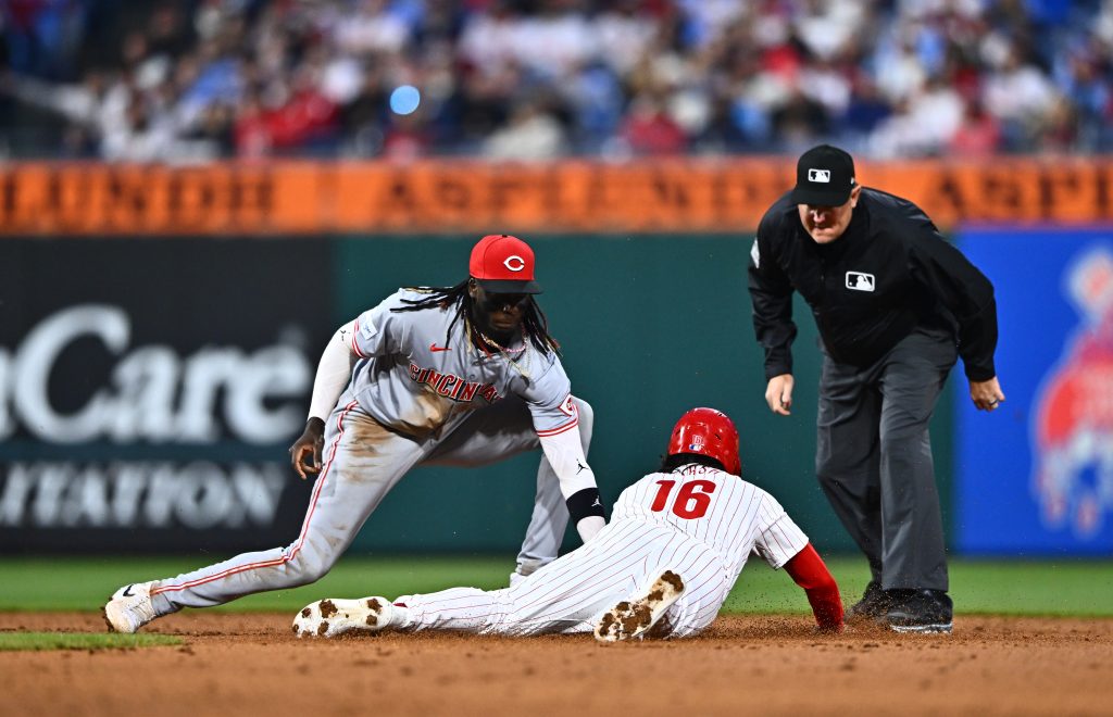 Reds shortstop Elly De La Cruz applies the tag on Brandon Marsh at Citizens Bank Park. (Kyle Ross-USA TODAY Sports)