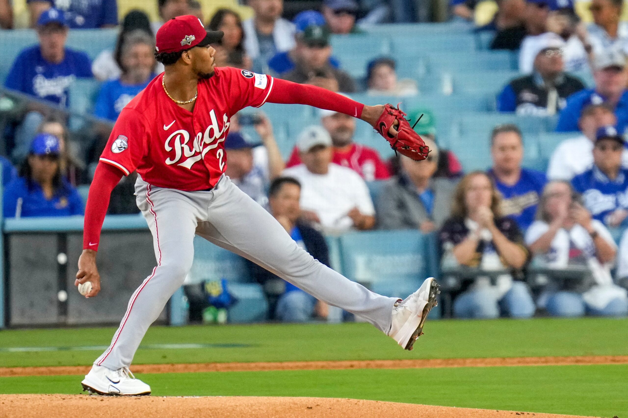 Reds ace Hunter Greene, here pitching against the Dodgers in the 2025 postseason, will be out until July after surgery on his right elbow. (Imagn Images)