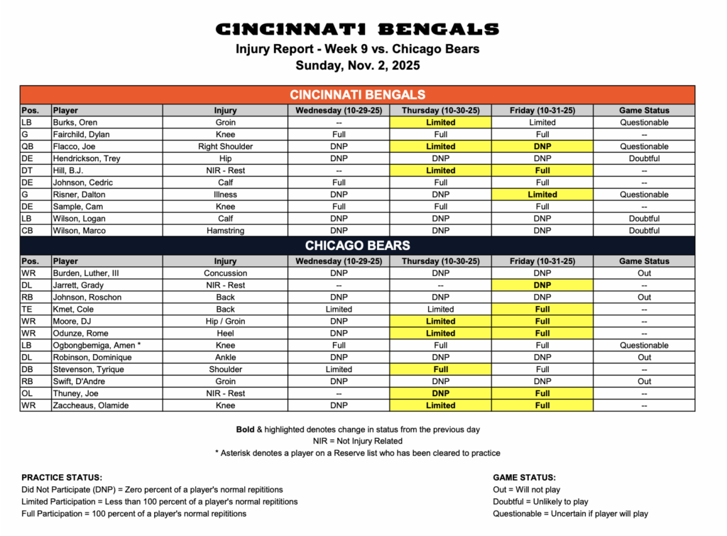 Bears (4-3) at Bengals (3-5) Sunday, Nov. 2 at Paycor Stadium (Field Turf CORE), 1 p.m. ET, TV: CBS: Locally WKRC-TV Ch. 12 (Cincinnati) Spero Dedes (PBP), Adam Archuleta (analyst), Aditi Kinkhabwala (sideline). Radio: Dan Hoard, Dave Lapham. 700 WLW AM, WEBN-FM (102.7 FM), ESPN1530.