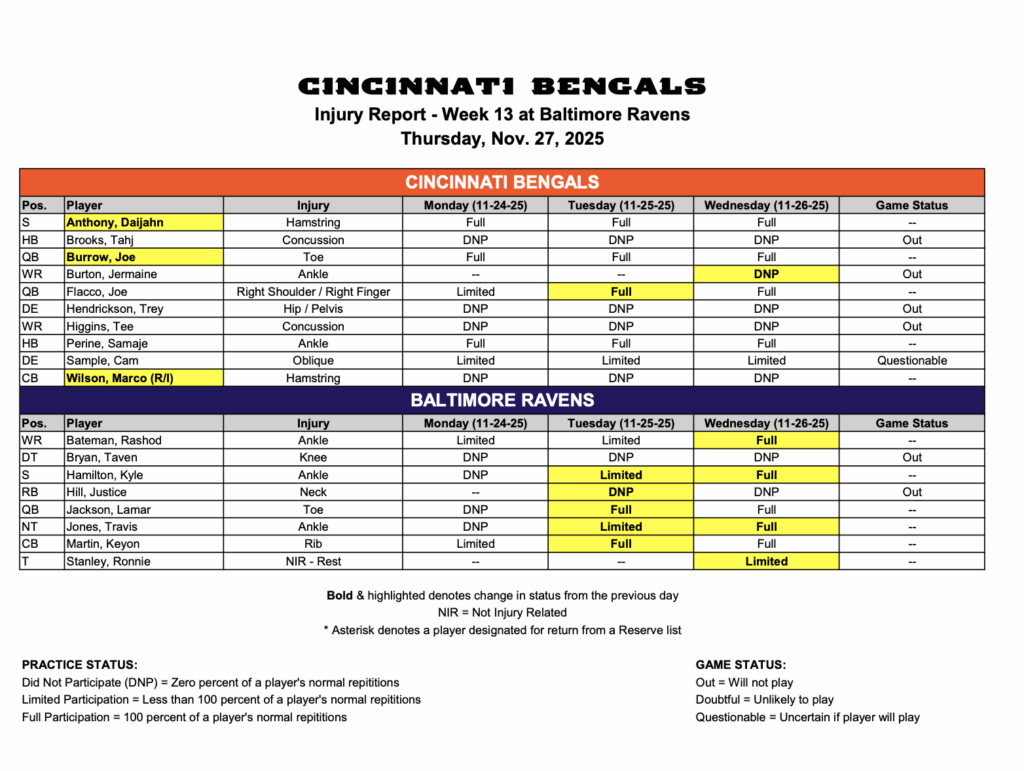 They also get the services back of star receiver Ja’Marr Chase after serving his one-game suspension for spitting at Jalen Ramsey, running back Samaje Perine (two games with an ankle injury) and safety Daijahn Anthony, who has missed the entire season with a hamstring injury.